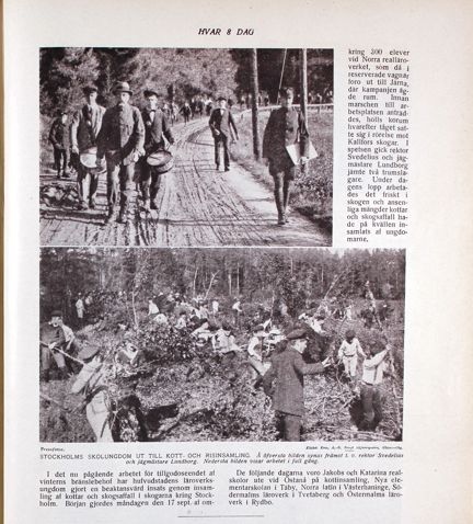 Det var inte bara brist på mat under krigsåren. I september 1917 åkte 300 elever från flera olika skolor i Stockholm till skogarna utanför staden för att samla in kottar och ris. Syftet med insamlingen var att bidra till vinterns bränsleförsörjning. Kottarna och riset skulle eldas upp i kakelugnar och vedspisar för att det inte skulle bli kallt i husen.