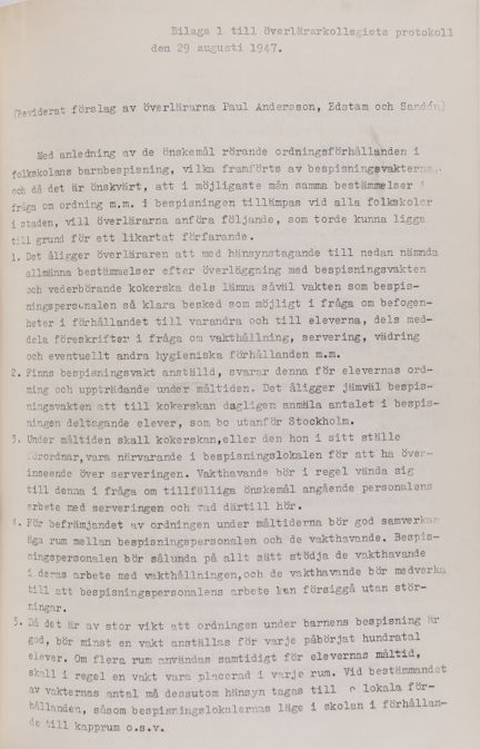 1947 önskade matvakter i skolmatsalar i Stockholm tydligare ordningsregler. Därför tog Överlärarkollegiet fram ett förslag som skulle gälla för alla skolmatsalar i Stockholm.